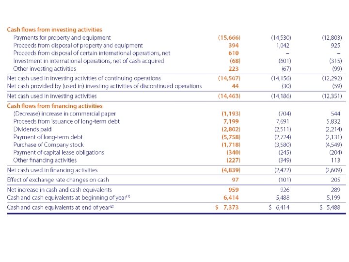 Uses of SCF • Assess liquidity • Alternate measure of performance • Helpful in predicting free cash flows