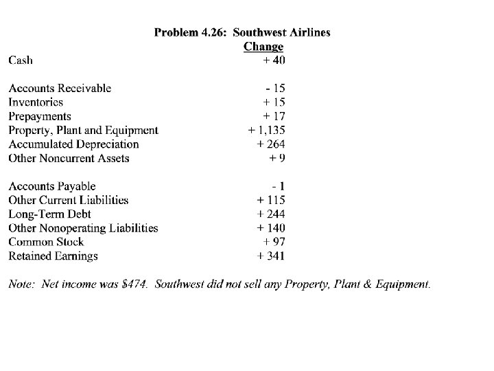 Changes in Liabilities and Shareholders’ Equity Operating (16) Retained Earnings (17) Treasure Stock (18) Cash Investing x(Net Inc)(+) _____ Financing x (Div. )(-) x(-) Increases and decreases are generally disclosed separately. 2 For sales of PP&E (or other investments), profits are subtracted from net income in the operating section and the entire proceeds is included as a source of cash in the investing section. 3 Generally combined with long-term debt. 1 Problem 4 -26