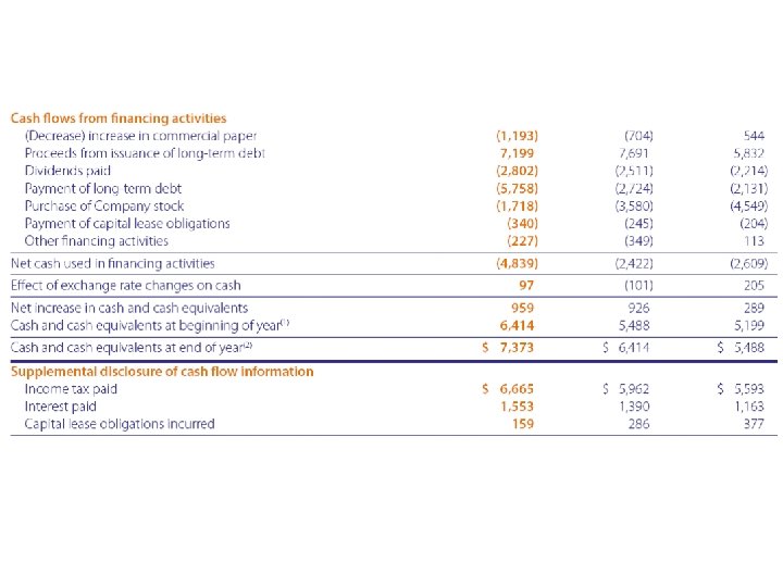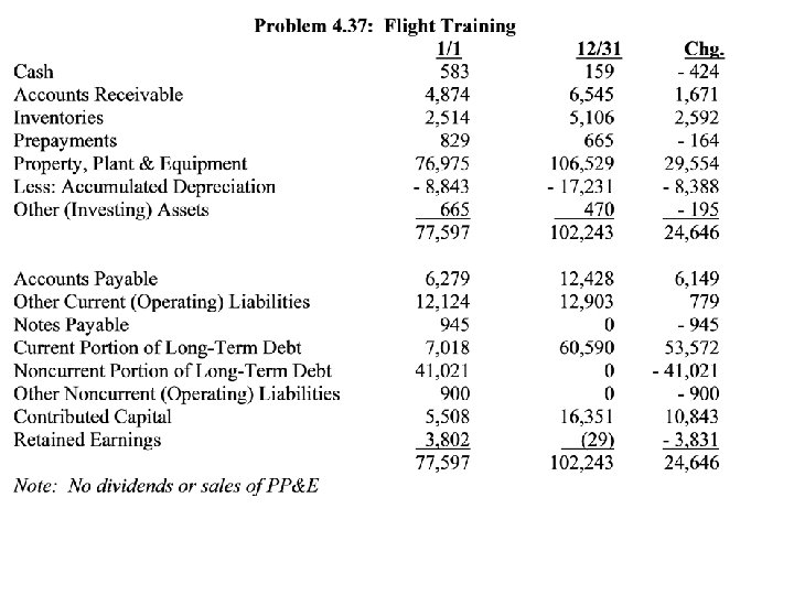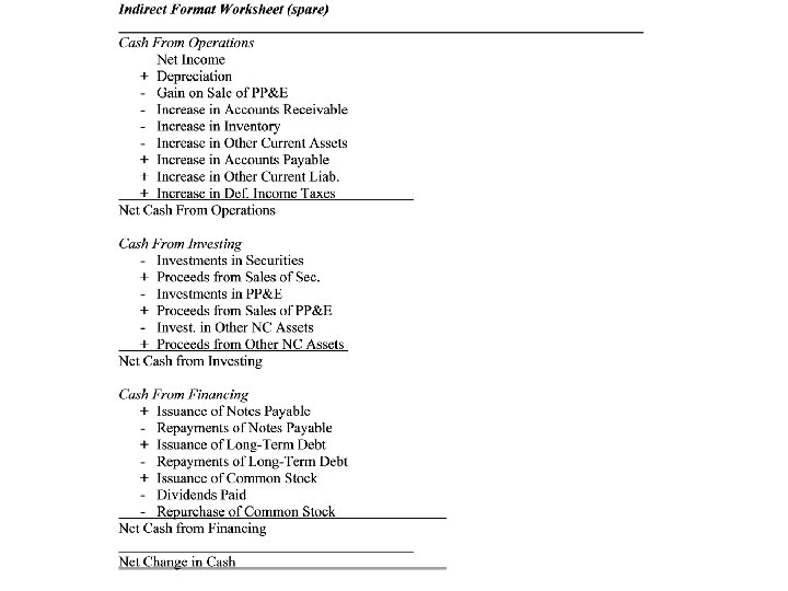 Preparing SCF (Indirect Method) • Start with attached worksheet with beginning and ending balances of non-cash accounts at ends & change in middle • As you work through, note each change that you’ve accounted for • If every change is accounted for, it must add