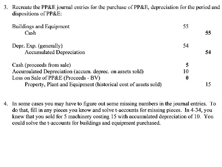 Sales of PP&E • Recreate the journal entry Cash Selling Price Acc. Depr. AD on Asset PP&E HC on Asset Gain on Sale Plug • goal is for only selling price to appear in investing • to do that, subtract gain (add loss) in operating • show selling price as a source of investing cash • that takes care of the AD and PP&E on worksheet • Problem 4 -34, etc.