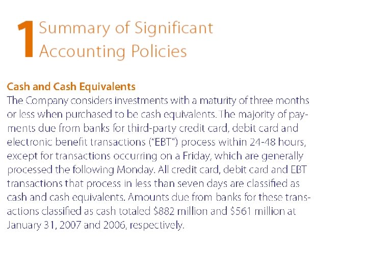 Overview of statement of cash flows • Explains changes in “Cash” during the period • “Cash” is cash plus cash equivalents - Equivalents are highly liquid short-term investments - E. g. , bank accounts, certificates of deposits, treasury bills and uncashed checks • There are typically no “SCF” accounts - infer SCF amounts from income statement and balance sheet - typically prepared after the other statements - hardest statement to interpret