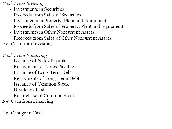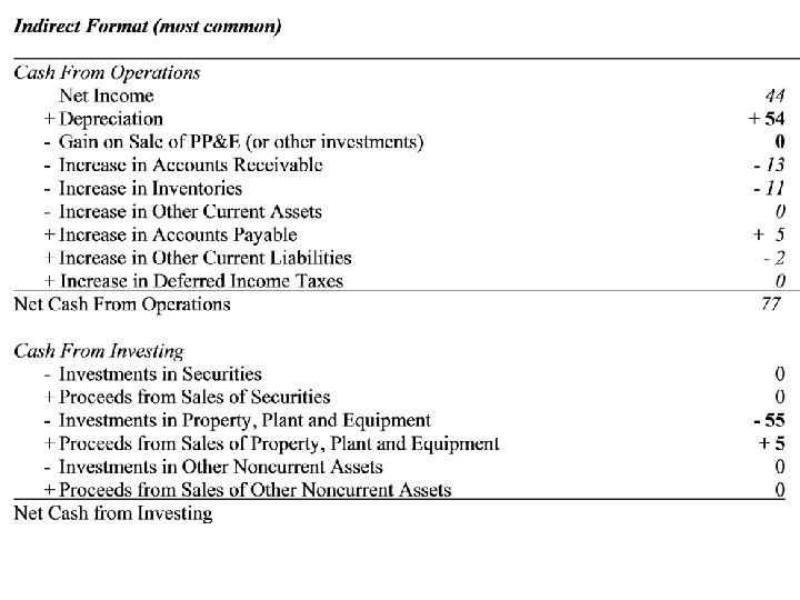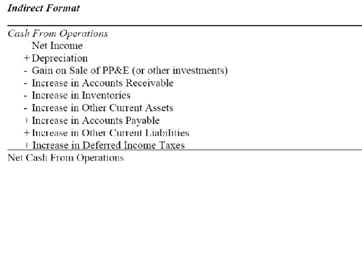 Formats for the SCF Indirect Format (most common) Cash From Operations Net Income + Depreciation Gain on Sale of PP&E Increase in Accounts Receivable Increase in Inventory Increase in Other Current Assets + Increase in Accounts Payable + Increase in Other Current Liab. + Increase in Def. Income Taxes