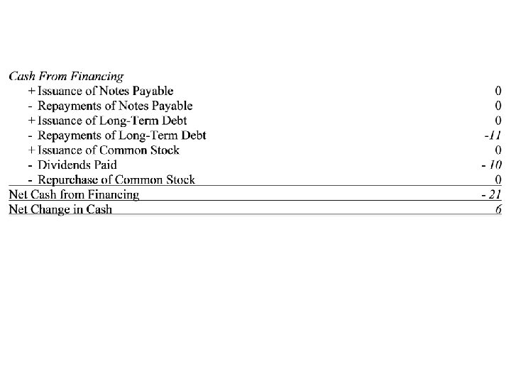 Cash From Financing + Issuance of Notes Payable Repayments of Notes Payable + Issuance of Long-Term Debt Repayments of Long-Term Debt + Issuance of Common Stock Dividends Paid Repurchase of Common Stock