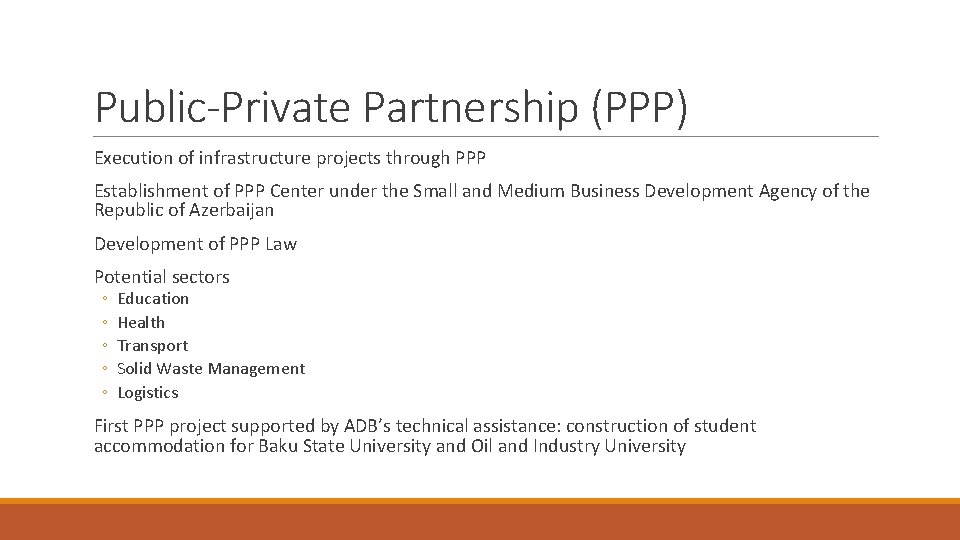 Public-Private Partnership (PPP) Execution of infrastructure projects through PPP Establishment of PPP Center under the Small and Medium Business Development Agency of the Republic of Azerbaijan Development of PPP Law Potential sectors ◦ ◦ ◦ Education Health Transport Solid Waste Management Logistics First PPP project supported by ADB’s technical assistance: construction of student accommodation for Baku State University and Oil and Industry University