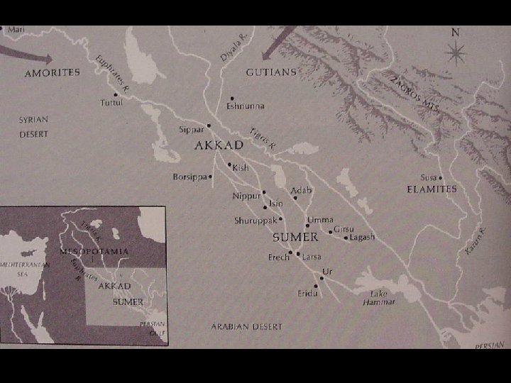 Mesopotamia: “The Cradle of Civilization” • Mesopotamia, meaning “Land between the Rivers” in Greek, refers to an area (roughly 600 by 150 miles) from the meeting of the Tigris and Euphrates Rivers, in Iraq • First clear states in the world with the emergence of powerful citystates like Uruk, Ur, Eridu and others in the Late Chalcolithic (4200 -3000 BC), which followed the small farming villages and towns (chiefdoms) of the region, associated with the preceding Early Chalcolithic “Ubaid” period (5900 -4200 BC) • By 3200 BC first “true” urban centers in lower Mesopotamia • Bronze Age (3000 -1200 BC) Mesopotamia included Sumer civilization and the Akkadian, Babylonian and Assyrian empires.