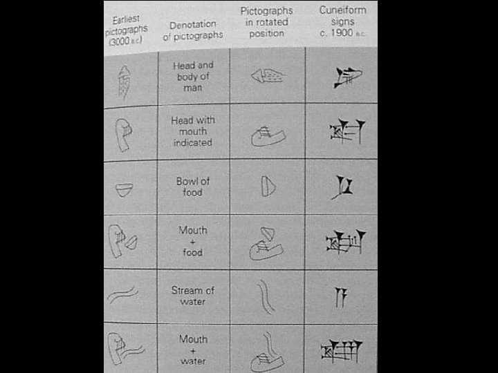 Writing cuneiform • By c. 3400 BC the first evidence of writing appears (pictographs) • sophisticated abstract iconographic writing in ancient Sumerian Civilization called cuneiform (“wedge”), developed by ca. 2500 BC • complex commercial transactions (accounting) are one theory for the increasing development of Sumerian writing