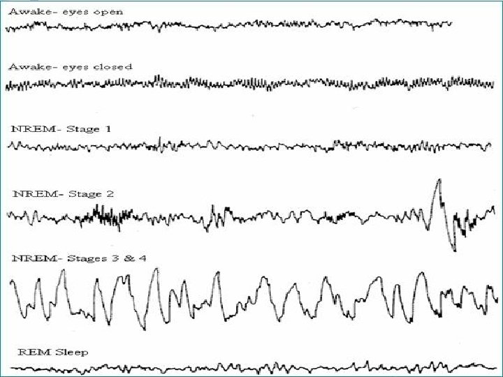 Stages of Sleep n Stages ¨Next 3 and 4 (Delta): 35 Minutes ¨Heart rate, blood pressure, and breathing drop to their lowest levels ¨Replenishing chemical supplies, growth hormones released, fortifying the immune system ¨Stage 4 has more than 50% delta waves