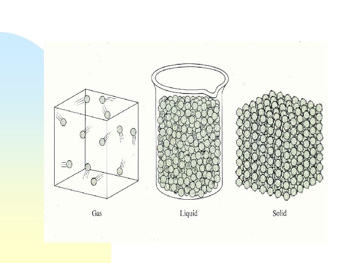The Liquid State n n n The atoms (or molecules) in the liquid state are held together by attractive forces. These forces are stronger than those between a gas but less than the forces holding a solid together. Liquids have both vibrational and rotational modes of energy. Surface tension, solubility, and capillary action are all properties of a liquid which aid in distinguishing one liquid from another.