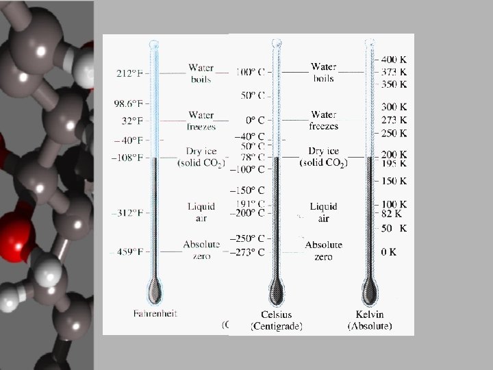 Temperature Scales • Fahrenheit English system – Water freezes at 32 degrees Fahrenheit and boils at 212 degrees. • Celsius modern system – freezing point of water 0 degrees Celsius, and the boiling point 100 degrees Celsius. • Kelvin A scale that is based on energy content. – At zero Kelvin (absolute zero) all molecular motion stops. – Scientists have figured out a way to get a temperature only a few billionths of a degree above absolute zero.