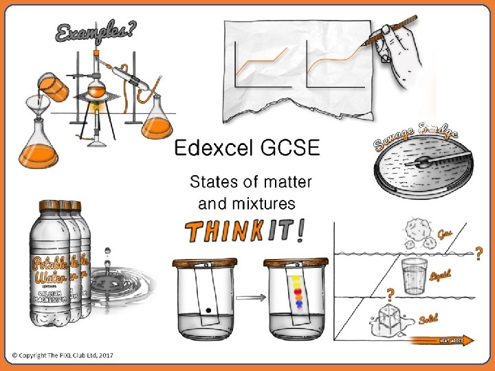 States of matter: • Describe three states of matter using the particle model. In extreme environments plasma may be present, describe this state. • Sublimation is a change in state between solids and gases. Using the particle theory, explain the changes taking place during sublimation. • During changes in state the temperature of the substance does not change. Explain why; what is this energy being used for? Potable water and waste water treatment: • Explain why potable water is not described as pure water. • Describe the two different processes that can be used to produce potable water form salty water. • Waste water is treated in sewage works. What are the implications for humans and the environment if all the sewage work stopped working? Predicting the state of matter: • Hexane has a melting point of -95 o. C and a boiling point of 69 o. C. What state would this be at 20 o. C. • Hydrogen chloride has a melting point of -112 o. C and a boiling point of -85 o. C. What state would this be at 25 o. C? Pure substances: • Sea water is not a pure substance. Explain why sea water cannot be described as pure • Draw graphs to compare the boiling points of pure water and sea water and explain what these graphs show. • Soap is often described as pure, would you agree with this statement? Explain your answer. Edexcel GCSE States of matter and mixtures Think. IT! © Copyright The Pi. XL Club Ltd, 2017 Mixtures: • Fizzy drinks are a mixture of several compounds including water, sugar, carbon dioxide. Describe the methods used to separate these compounds from the mixture. • Air is a mixture of gases. Suggest how these gases could be separated using your knowledge of kinetic theory. • Food scientists can identify the different colours in food colouring. Describe and explain how. You can use a diagram. : Changes in State: • Ammonia is a liquid between -77. 7 °C and -33. 3°C. Use the kinetic theory to explain the three states of matter in this case. • Using the particle theory, predict how temperature and pressure affect the density of a fixed mass of gas. • HT only - Explain the limitations of the particle theory. Chromatography: • Chromatography is carried out on three pure substances: A has an Rf value of 0. 7, B has an Rf value of 0. 4, C has an Rf value of 0. What can you conclude from this? • Explain how paper chromatography separates mixtures. • Describe how you could use chromatography to separate a pure substance from a mixture of three pure substances. Mixtures: • A mixture of salt water and sand needs to be separated into its three separate components. For each component describe the method used to separate it. Draw a diagram of the equipment. • Crude oil can be separated using fractional distillation. Describe how this process works.