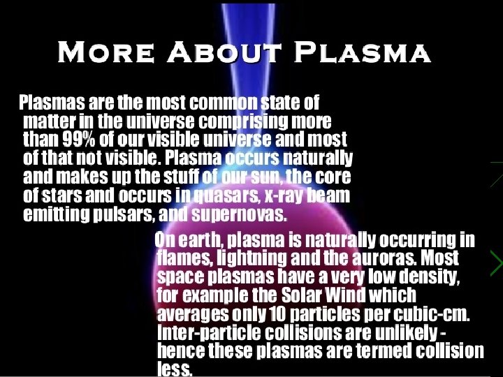 States of Matter -- Plasma Characteristics: § Atoms are stripped of their electrons § Nuclei are packed close together § Occurs at extremely high temperatures (like inside a star)