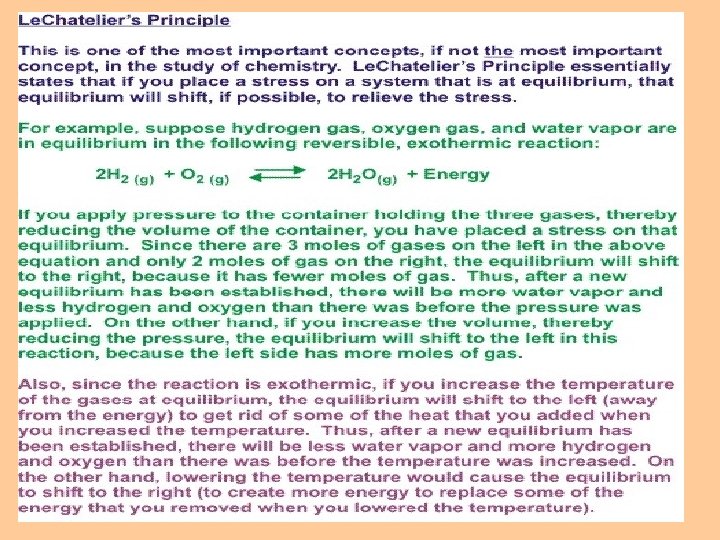 EQUILIBRIUM: dynamic condition in which two opposing processes/changes occur at equal rates in a closed system Le Chatlier’s principle: when a system at equilibrium is disturbed by the application of a stress, it attains a new equilibrium position that minimizes the stress STRESS = concentration, pressure, or temperature – change any of these 3 and you cause the system to “shift” Think of Le Chatlier as a see-saw – what happens on one end must be balanced by a move either toward something missing or away from something added
