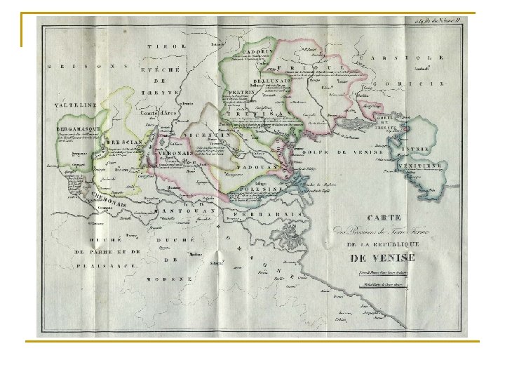 Un problema nel problema n n n A lungo si è studiata Venezia ignorando il rimanente dello Stato. Eccezioni nel dopoguerra: Marino Berengo 1956, L’agricoltura veneta alla fine del Settecento Angelo Ventura 1964: Nobiltà e popolo nella terraferma veneziana del 400 e del 500 (Bari 1964)