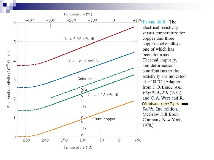 Electrical Resistivity of Metals Resistivity: Scattering of electrons due to crystal defects Increasing the numbers of defect raises resistivity( lowers conductivity) Number of defects depend on temperature, composition, specimen, and thermal history total = t + i + d Matthiessen’s Rule t = thermal contribution i = impurity contribution d = plastic deformation independent