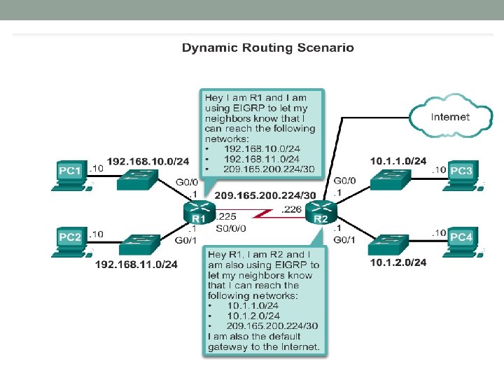 Static Routing Why Use Static Routing? (continued) Static routing has the following disadvantages: Initial configuration and maintenance is time-consuming. Configuration is error-prone, especially in large networks. Administrator intervention is required to maintain changing route information. Does not scale well with growing networks; maintenance becomes cumbersome. Requires complete knowledge of the whole network for proper implementation.