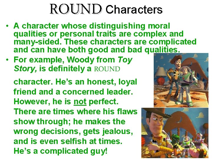 ROUND Characters • A character whose distinguishing moral qualities or personal traits are complex and many-sided. These characters are complicated and can have both good and bad qualities. • For example, Woody from Toy Story, is definitely a ROUND character. He’s an honest, loyal friend a concerned leader. However, he is not perfect. There are times where his flaws show through; he makes the wrong decisions, gets jealous, and is even selfish at times. He’s a complicated guy!