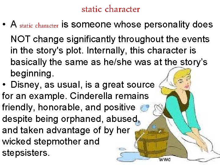 static character • A static character is someone whose personality does NOT change significantly throughout the events in the story's plot. Internally, this character is basically the same as he/she was at the story’s beginning. • Disney, as usual, is a great source for an example. Cinderella remains friendly, honorable, and positive despite being orphaned, abused, and taken advantage of by her wicked stepmother and stepsisters.