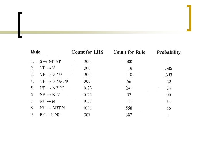 Illustration n Wall Street Journal Corpus 3 000 words Correct parse tree for sentences known ¡ ¡ ¡ Constructed by hand Can be used to derive stochastic context free grammars SCFG assign probability to parse trees n Compute the most probable parse tree