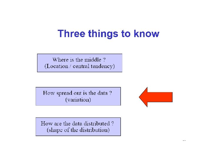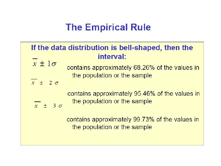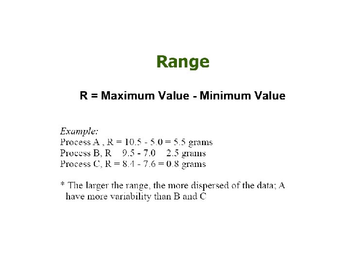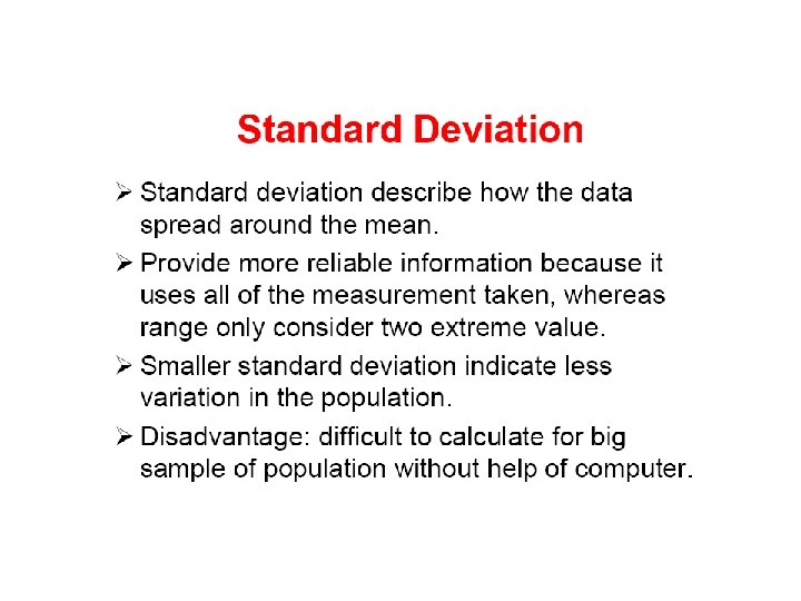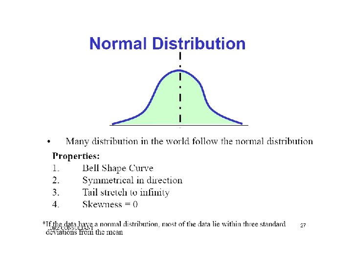 Descriptive Statistics include: The Mean- measure of central tendency The Range- difference between largest/smallest observations in a set of data Standard Deviation- measures the amount of data dispersion around mean – Measure of dispersion Distribution of Data shape § Normal or bell shaped or § Skewed