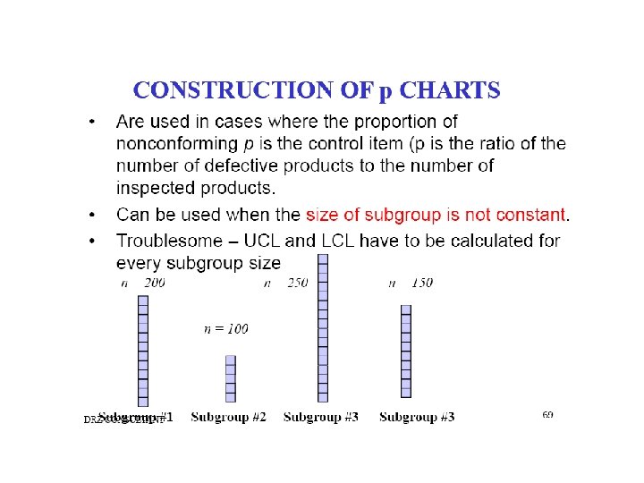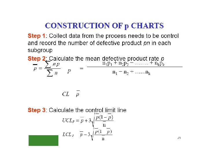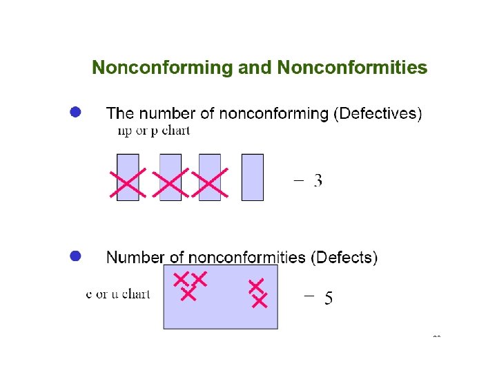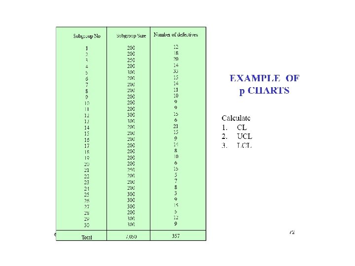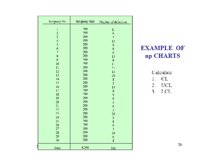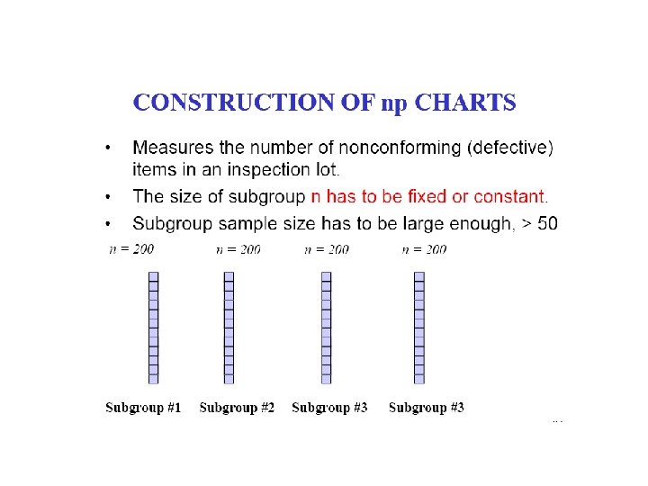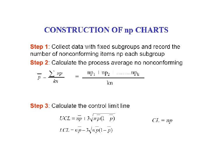The np chart uses counts while the p chart uses percent's, or fractions of nonconforming. The same steps are used to construct the np chart that are used to construct the p chart. There is one difference the centre line for the p chart is based on the average percent nonconforming. The centerline for np chart is calculated as follows: np= (subgroup size) (total number nonconforming/ total number inspected.
