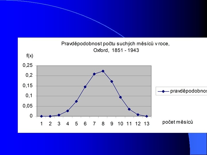 Příklad 2, binomické rozdělení l l l l Vypočítejte pravděpodobnost, se kterou se vyskytne určitý počet měsíců v roce hodnocených jako „ suché“. Konkretizace: oblast Oxford, období 1851 – 1943, tj. 1116 měsíců Suchý měsíc - tj. méně srážek v měsíci než je dlouhodobý průměr tohoto měsíce. 617 měsíců hodnocených jako suché 499 – vlhké měsíce