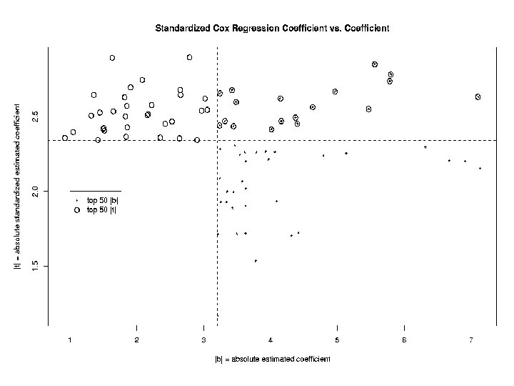 Identification of Genes Associated with Survival For each gene j, j = 1, …, 3613, model the instantaneous failure rate, or hazard function, h(t) with the Cox proportional hazards model: h(t) = h 0(t) exp( jxij) and look for genes with both: ^ • large effect size j ^ ^ • large standardized effect size j/SE( j)