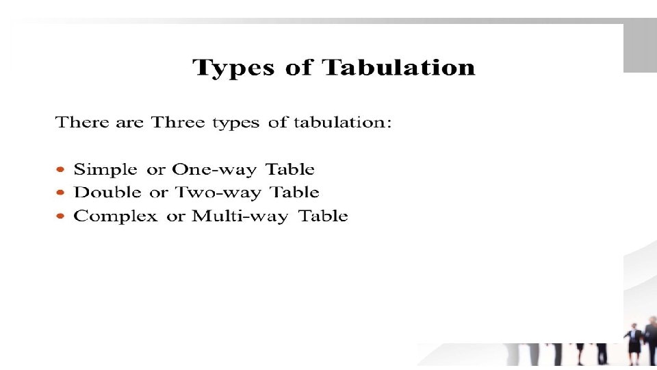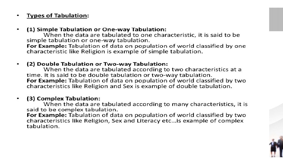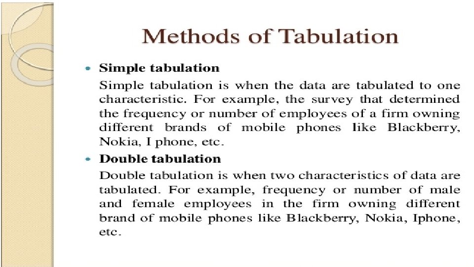 Tabulation Meaning: Tabulation is a systematic & logical presentation of numeric data in rows and columns, to facilitate comparison and statistical analysis. It facilitates comparison by bringing related information close to each other and helps in further statistical analysis and interpretation. To put it in other words, the method of placing organised data into a tabular form is called as tabulation. It may be complex, double or simple depending upon the nature of categorisation.