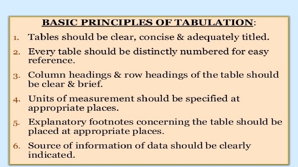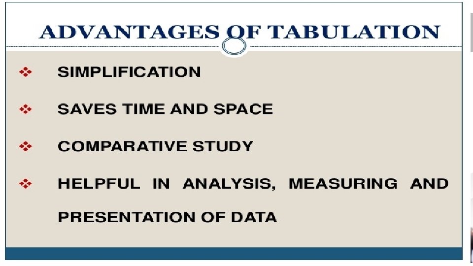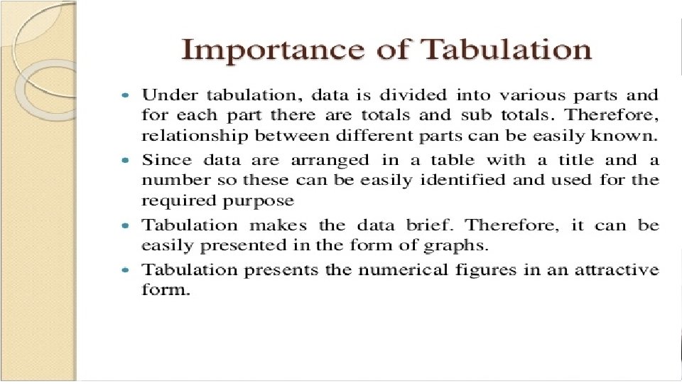 4) To Facilitate Statistical Analysis Tables serve as the best source of organised data for further statistical analysis. The task of computing average, dispersion, correlation, etc. becomes much easier if data is presented in the form of a table. (5) Saving of Space A table presents facts in a better way than the textual form. It saves space without sacrificing the quality and quantity of data.