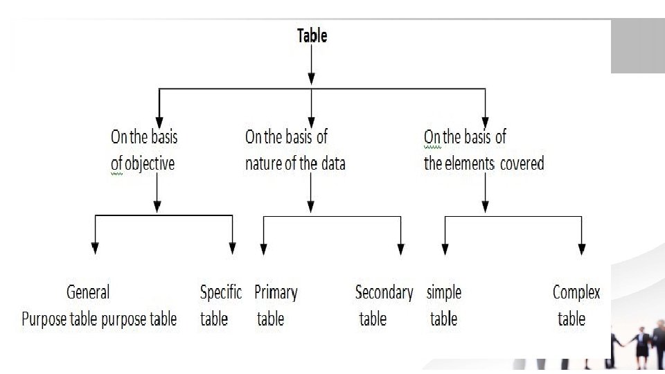 Essential parts of a table: A statistical table is divided into 8 parts, which are explain below. i. Title of the table: A title is a heading at the top of the table describing its contents. A title usually tells us, what is the nature of the data, where the data are, what time period do the data cover, how are the data classified. ii. Caption: The headings for various column and rows are called columns caption and row caption.