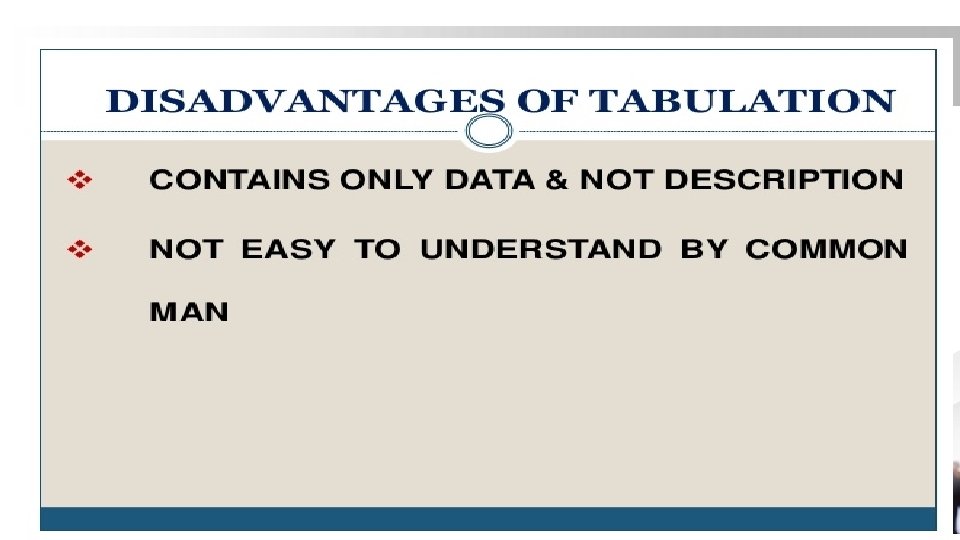 (1) To Simplify the Complex Data It reduces the bulk of information i. e. raw data in a simplified and meaningful form so that it could be easily by a common man in less time. (2) To Bring Out Essential Features of the Data It brings out the chief/main characteristics of data. It presents facts clearly and precisely without textual explanation. (3) To Facilitate Comparison Presentation of data in row & column is helpful in simultaneous detailed comparison on the basis of several parameters.