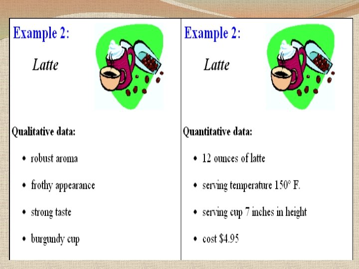 Quantitative and Qualitative �Qualitative Data Overview: Deals with descriptions. Data can be observed but not measured. Colors, textures, smells, tastes, appearance, beauty, etc. Qualitative → Quality