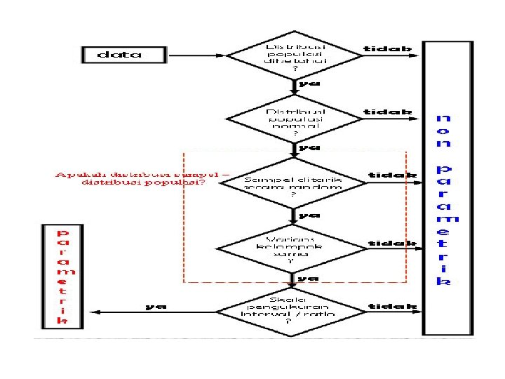 Penggunaan… • Untuk data yang distribusi populasinya tidak diketahui • Untuk data yg distribusinya tidak normal. • Untuk data yang diambil dari sampel yang tidak random. • Untuk data dengan skala nominal atau ordinal. • Untuk data yang jumlahnya sedikit (< 30).