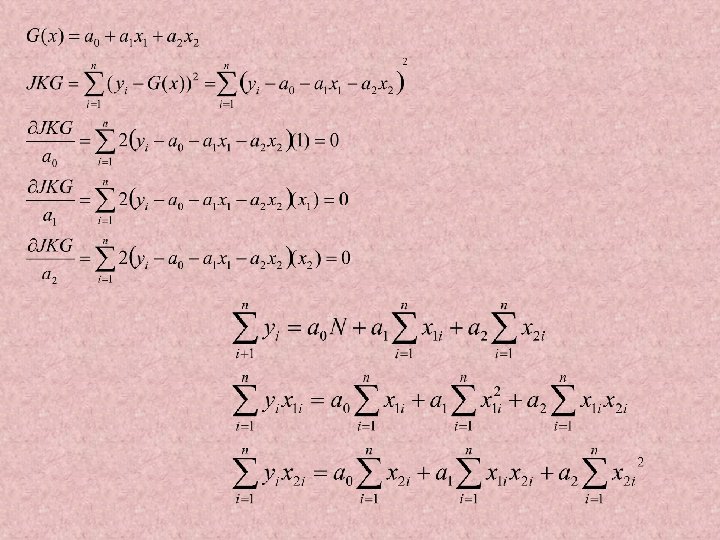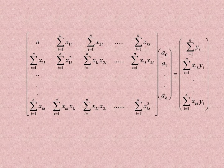 Galat regresi • Hubungan antara data pengamatan yi=a 0+a 1 x 1 i+a 2 x 2 i+……+arxri+ei ei=yi-a 0 -a 1 x 1 i-a 2 x 2 i-……. -arxri • Jumlah kuadrat galat