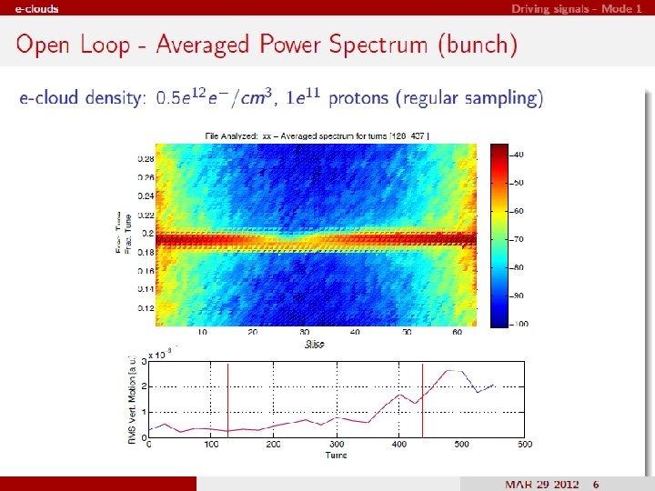 Spectral mode analysis: Feedback OFF Evolution of vertical position of bunch slices during 512 turns, e-cloud density 6 e 11 e/m 3 Bunch oscillation modes as a function of cloud density