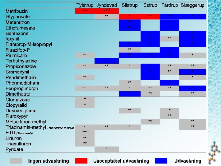 Sammendrag: Tre års monitering af 26 forskellige pesticider kan summeres som følger: • 2 stoffer kan udvaskes af rodzonen i uacceptabelt, høje koncentrationer • Yderligere 13 andre stoffer er set udvaskes, dog ikke i koncentrationer over den tilladte grænseværdi • Andre 11 stoffer udvaskes slet ikke.