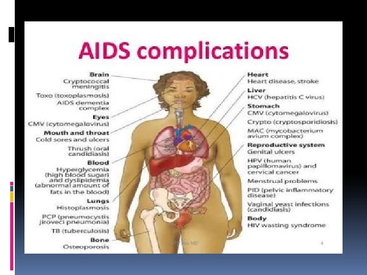 3. Persistent generalized lymphadenopathy (PGL) Ø This has been defined by presence of enlarged lymph nodes, atleast 1 cm in diameter , in two or more non contiguous extra inguinal sites, that persist for atleast three months, in the absence of any current illness or medication that may cause lymphadenopathy. Ø CD 4 count is less than 500 per microlitre Ø These are diagnostic of HIV when blood tests are positive for antibodies.