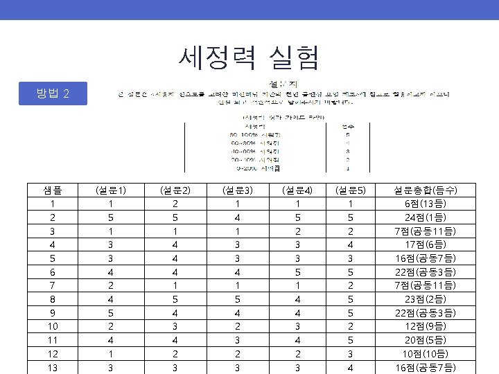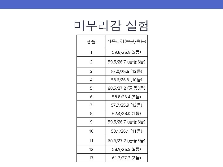 세정력 실험 샘플 세정력 등수 1 13 2 1 3 12 4 6 5 7 6 4 7 11 8 2 9 3 10 9 11 5 12 10 13 8