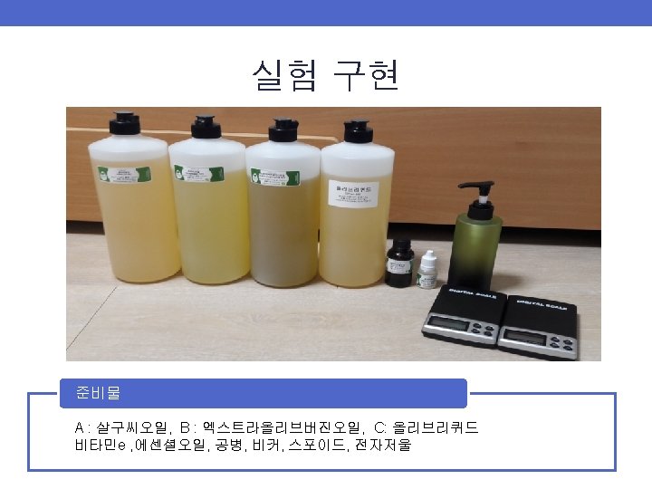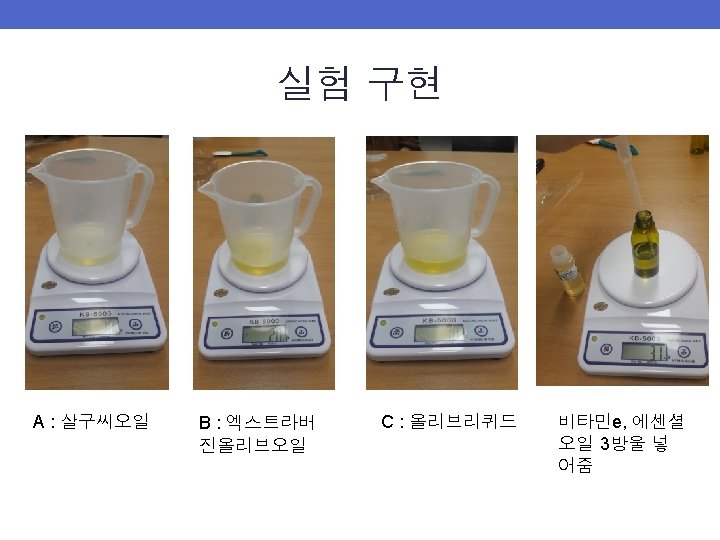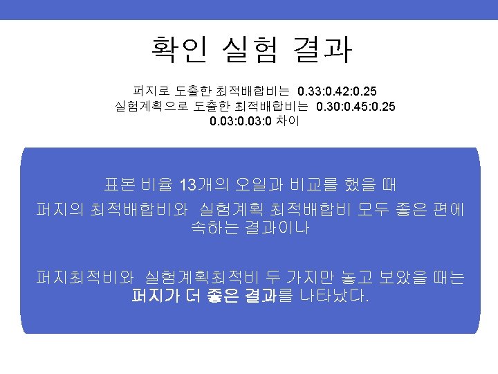 실험 설계 Std. Order 1 2 3 4 5 6 7 8 9 10 11 12 13 Pt. Type 1 1 2 2 0 -1 -1 A 0. 2 0. 75 0. 55 0. 2 0. 65 0. 475 0. 375 0. 425 0. 3125 0. 5875 0. 4875 B 0. 75 0. 55 0. 2 0. 65 0. 2 0. 475 0. 375 0. 425 0. 5875 0. 4875 0. 3125 혼합물 실험계획법으로 Extreme Vertices Design(꼭지점설계법) 을 채택 총 13개 실험조건을 도출. (Minitab R 15 이용) C 0. 05 0. 25 0. 15 0. 05 0. 25 0. 1 0. 2