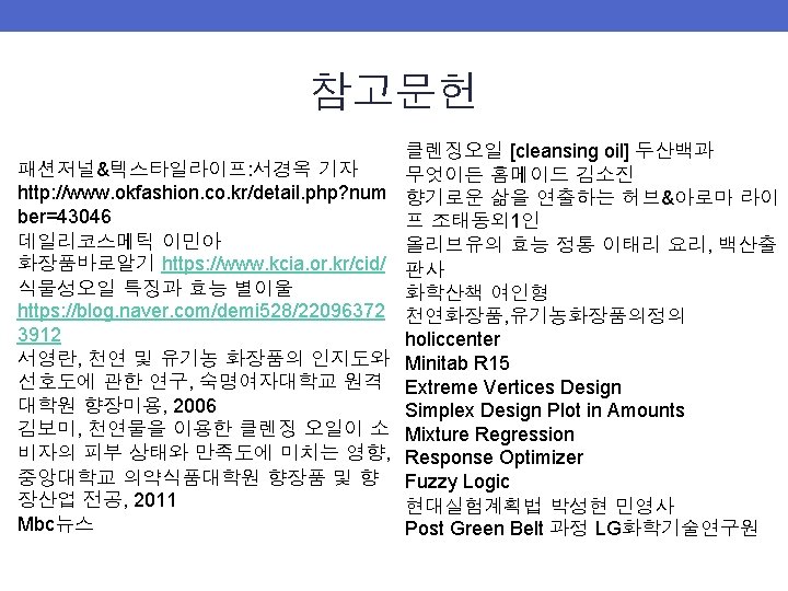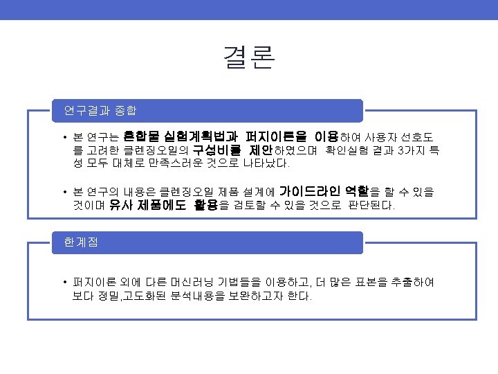 실험데이터 수집 결과 • Y 1: 세정력 • Y 2: 유화력 • Y 3: 마무리감-수분 • Y 4: 마무리감-유분 Std. Order Pt. Type A B C y 1 y 2 y 3 y 4 1 1 0. 2 0. 75 0. 05 2 1 0. 2 0. 55 0. 25 3 1 0. 75 0. 2 0. 05 4 1 0. 55 0. 25 5 2 0. 65 0. 15 6 2 0. 65 0. 2 0. 15 7 2 0. 475 0. 05 8 2 0. 375 0. 25 9 0 0. 425 0. 15 10 -1 0. 3125 0. 5875 0. 1 11 -1 0. 3125 0. 4875 0. 2 12 -1 0. 5875 0. 3125 0. 1 13 -1 0. 4875 0. 3125 0. 2 6 24 7 17 16 22 7 23 22 12 20 10 16 10 9 5 9 7 7 8 9 8 10 7 9 9 59. 8 59. 5 57 58. 6 60. 5 58. 8 57. 7 62. 4 59. 5 58. 1 60. 6 58. 9 61. 7 26. 9 26. 7 25. 6 26. 3 27. 2 26. 4 25. 9 28 26. 7 26. 1 27. 2 26. 5 27. 7