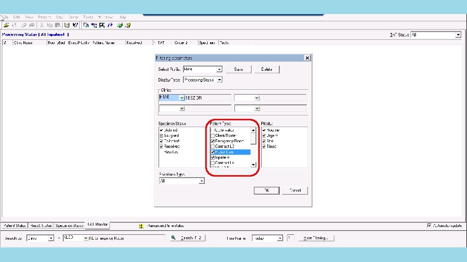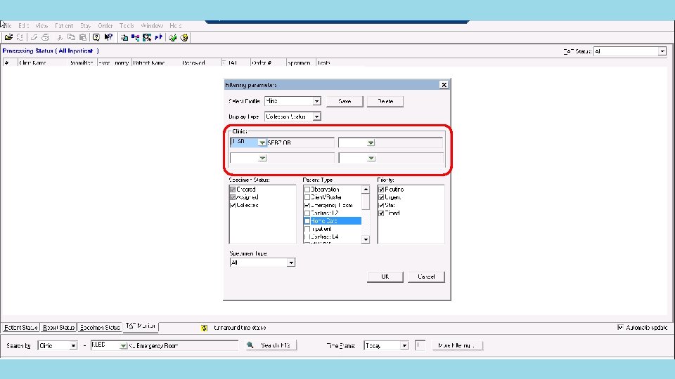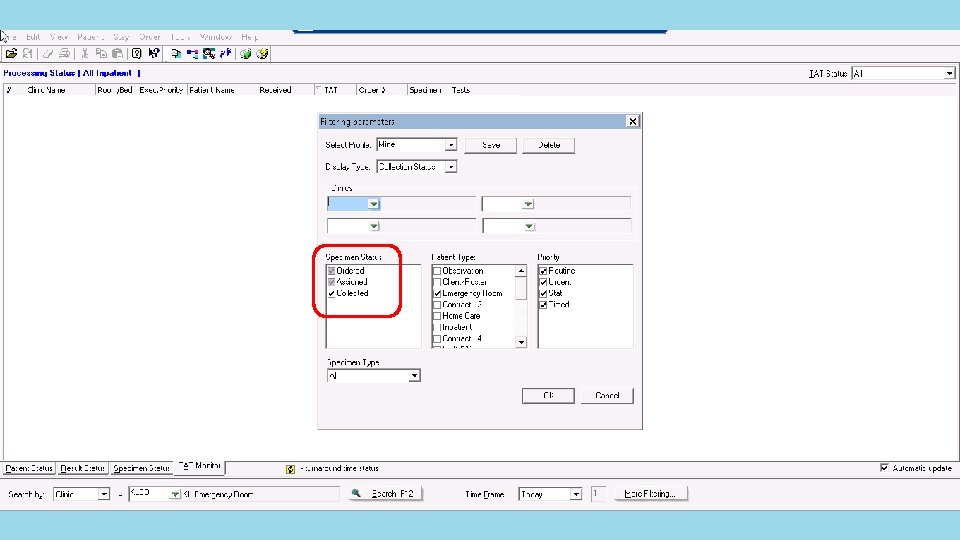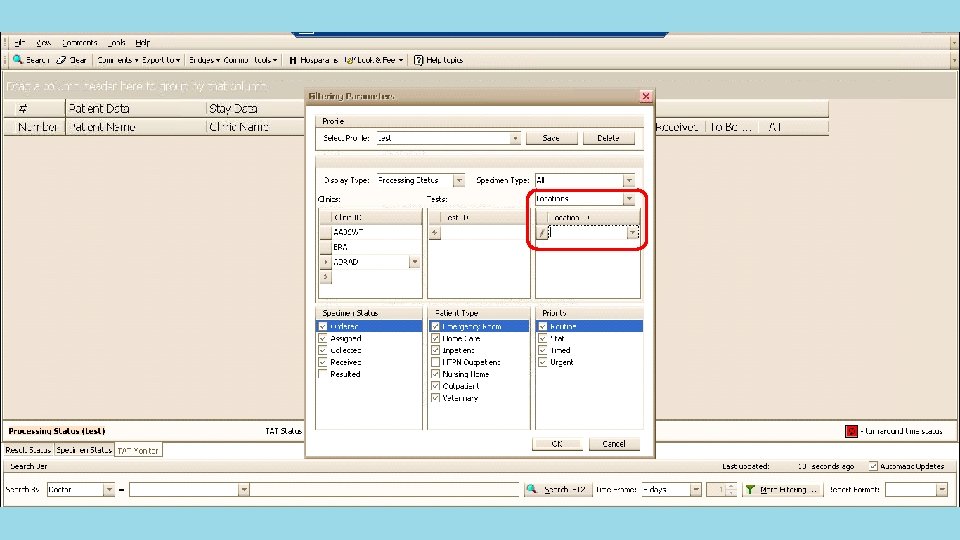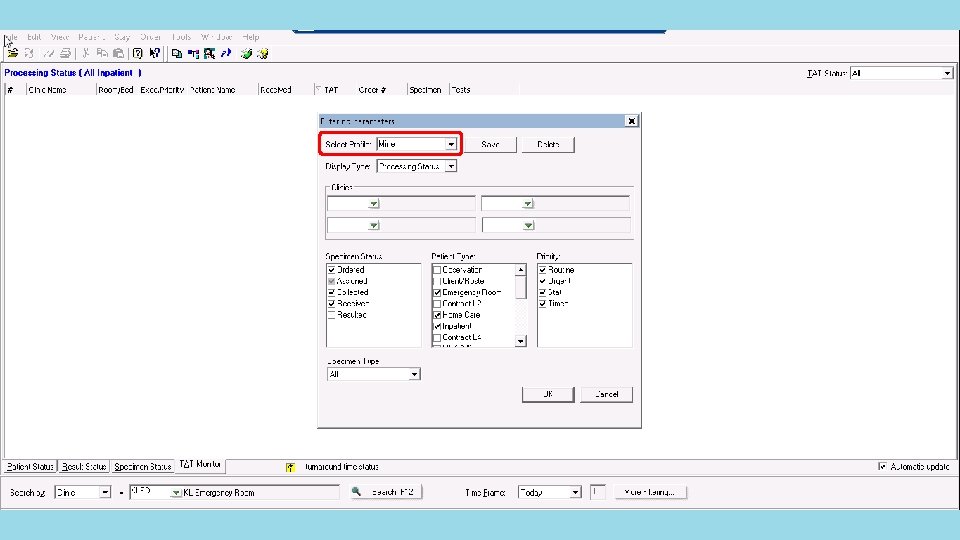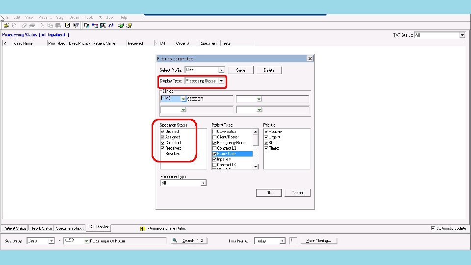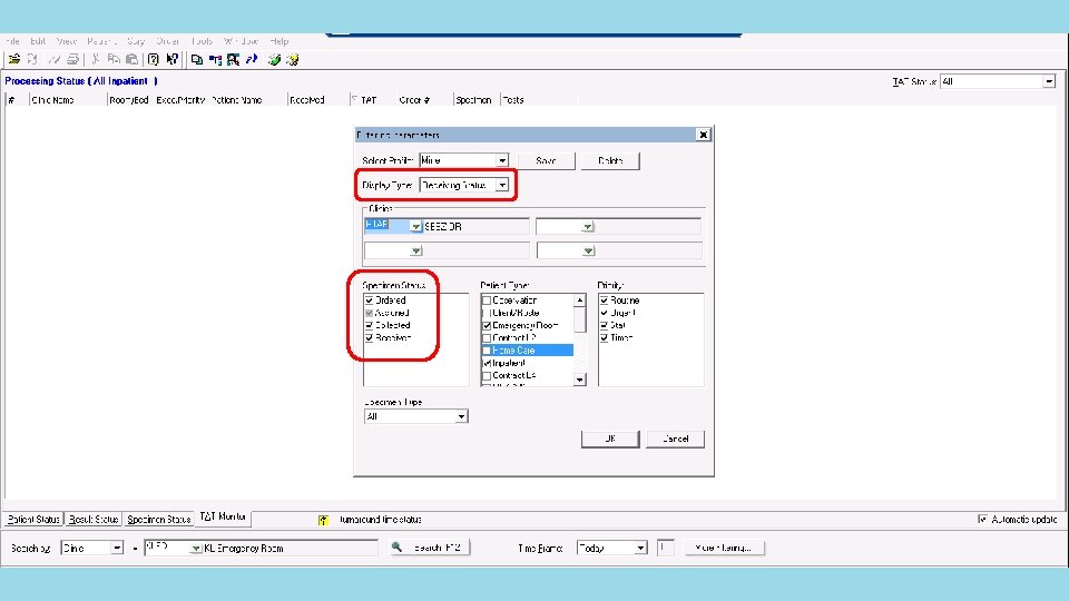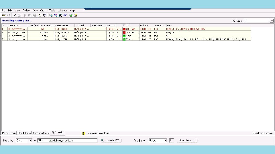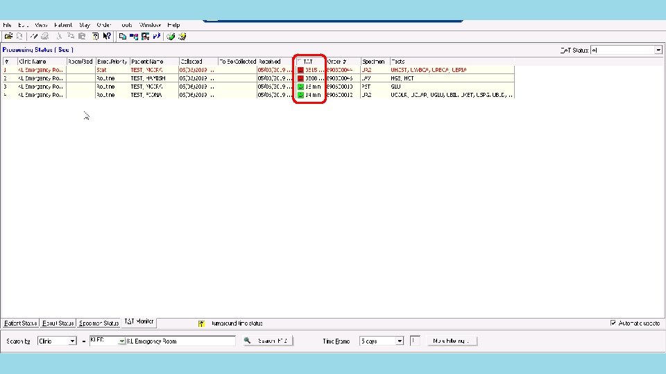 What determines the TAT Color? ]Collection Status- TAT_to_collect defines overdue and approaching overdue by priority ]Receiving Status- TAT_to_receive defines overdue and approaching overdue by priority ]Processing Status- 4 Governed by test setup and three params. Test setup defines time limits by priority 4 GUI_TATapproaching defines what percentage of the times defined in test setup can go by before the indicator switches to yellow. 4 GUI_TAToverdue defines what percentage of the times defined in test setup can go by before the indicator switches to red. 4 GUI_TATStart. Stop defines whether TAT is measured Collection to Verified or Received to Verify