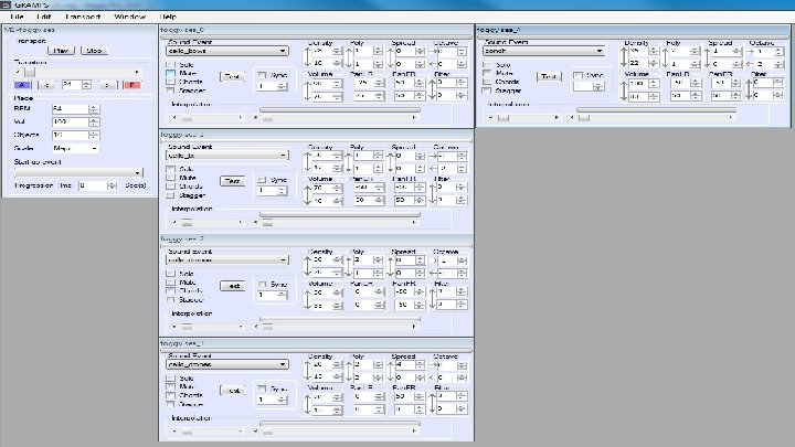 Each channel panel has the following features: - Set Wise event (can represent any number of sounds) - How frequently the event is likely to play (value is in beats) - How many notes can be triggered simultaneously - If more than one note triggered, spread can force them apart - Set octave, if both boxes are 0 then don't transpose, if both boxes the same value other than 0 then transpose, if both values are different, snap to the scale. - Randomise volume, pan and LPF - Chord forces notes to snap to chords (listed in the XML) - Stagger adds a random delay when the piece is first started