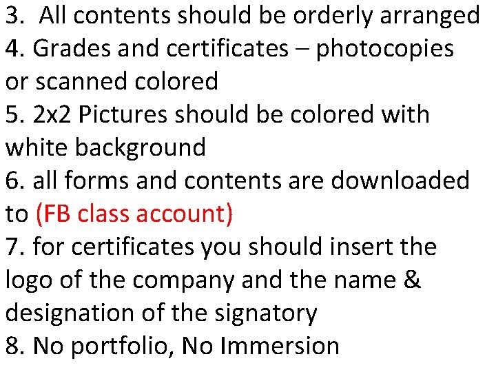 3. All contents should be orderly arranged 4. Grades and certificates – photocopies or scanned colored 5. 2 x 2 Pictures should be colored with white background 6. all forms and contents are downloaded to (FB class account) 7. for certificates you should insert the logo of the company and the name & designation of the signatory 8. No portfolio, No Immersion