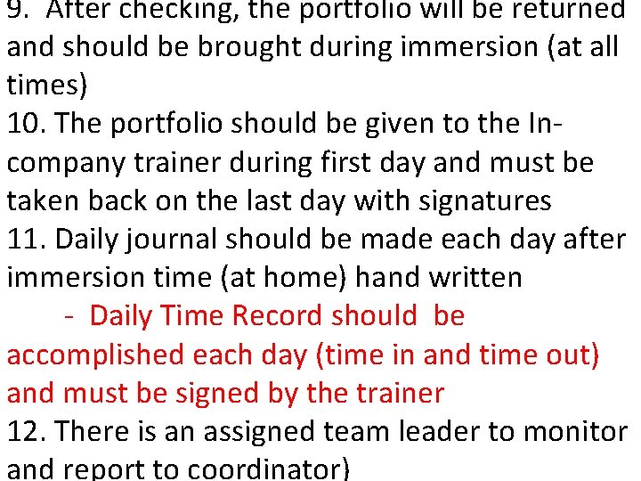 9. After checking, the portfolio will be returned and should be brought during immersion (at all times) 10. The portfolio should be given to the Incompany trainer during first day and must be taken back on the last day with signatures 11. Daily journal should be made each day after immersion time (at home) hand written - Daily Time Record should be accomplished each day (time in and time out) and must be signed by the trainer 12. There is an assigned team leader to monitor and report to coordinator)