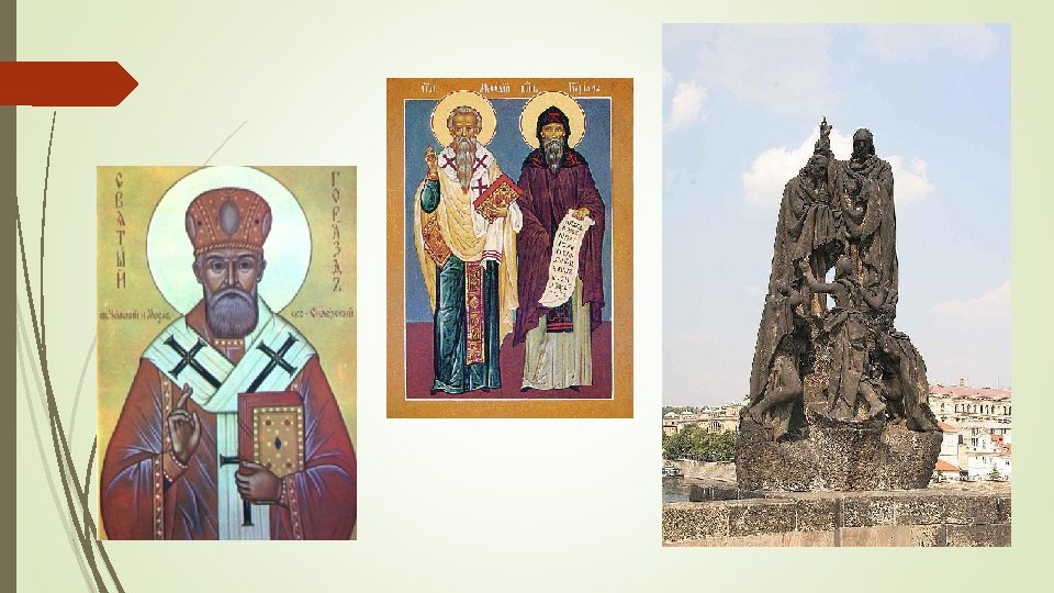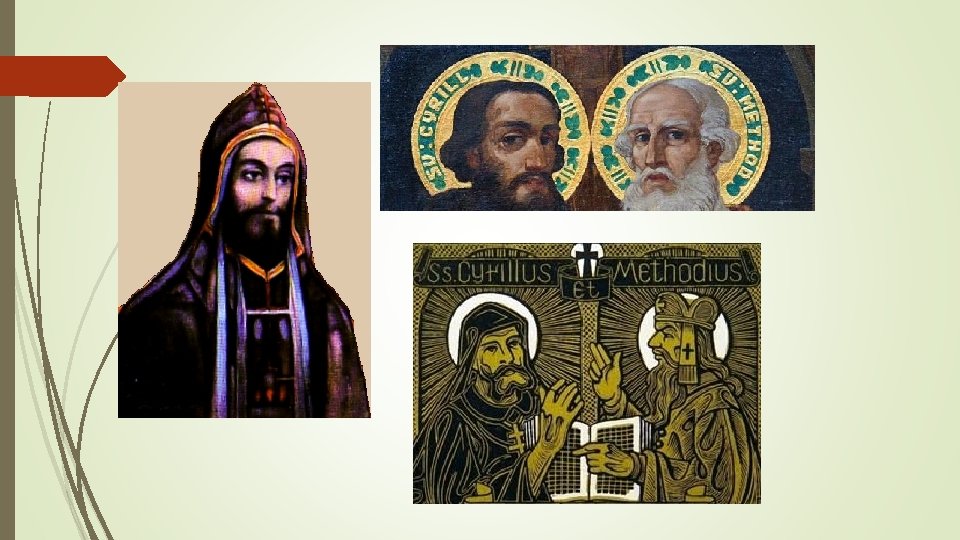 Svatý Konstantin - Cyril zvaný Filozof, první vychovatel a učitel slovanského národa, „apoštol Slovanů“ mladší bratr Metoděje profesor filozofie na univerzitě v Konstantinopoli hlaholice na popud knížete Rastislava byl s Metodějem vyslán na Velkou Moravu 863 n. l. šíření křesťanství a potlačení vlivu německých kmenů a latinských vlivů vedení bohoslužeb ve staroslověnštině zemřel v Římě r. 1880 byl katolickou církví prohlášen za svatého i s Metodějem „spolupatron Evropy“