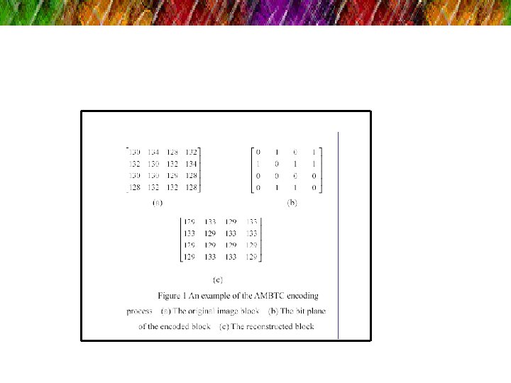 Example ( Encoding –AMBTC ) q Figure 1(a) shows the pixel values of an image block of 4× 4 pixels. q The bit plane of the encoded block from Figure 1(a) is shown in Figure 1(b), where x equals 131. q Two quantization levels l and h of AMBTC are 129 and 133, respectively. q The reconstructed block using the triple (l, h, B) is shown in Figure 1(c).