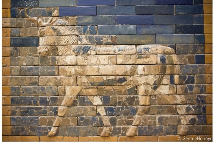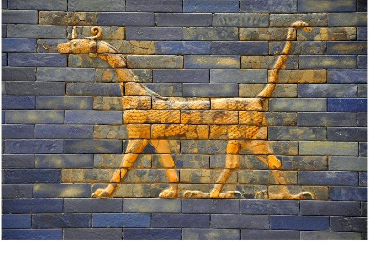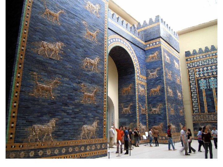 Ishtar Gate and Throne Room Wall Neo-Babylonia c. 575 BCE There were eight double gates that surrounded the city of Babylon. N, ascended to the throne and proceeded to rebuild the ancient city of Babylon. This gate and the wall are the remnants of N. building program. He fortified and strengthened eleven miles of wall around the city; he reconstructed the Great Ziggurat of Babylon, he created palaces and hanging gardens. The lions represent Ishtar.