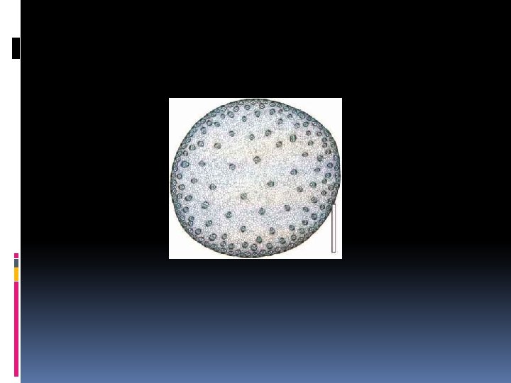 Atactostele In Atactostele consists of collateral bundles distributed in more that one ring within the Stem. This does not mean that the bundles are randomly arranged. A complex organizational pattern is present, but it is not obvious to a casual observer. A Pith is not present. There is no Endodermis. This stele is typical for Monocots like Sugarcane.