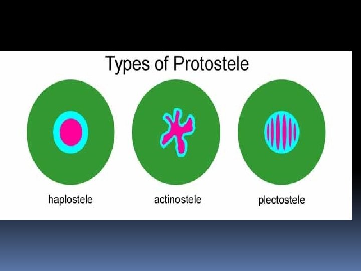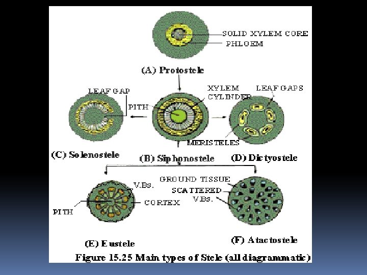 Protostele Actinostele Plectostele Siphonostele Apmhiphloic siphonostele Solenostele Dictyostele Eustele Attactostele