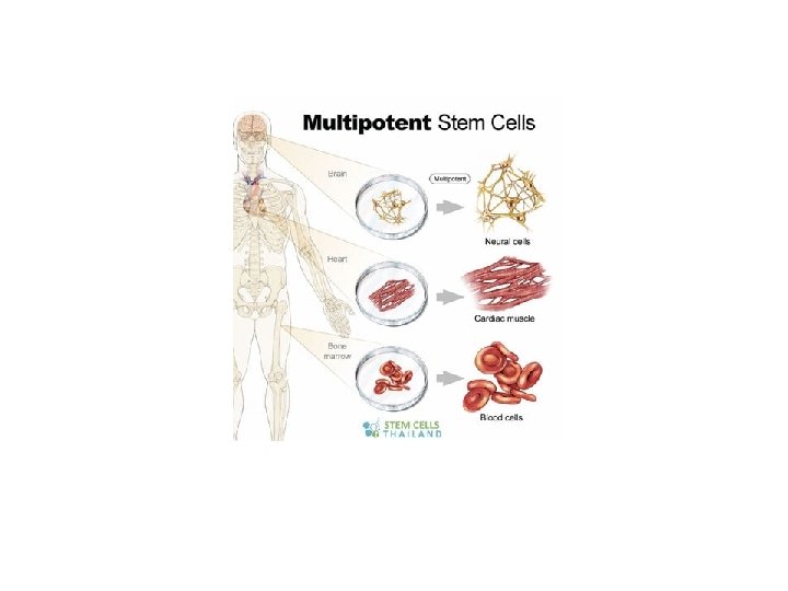 Multipotent: adult stem cells • The cells become more differentiated and specialised. BUT!. . . • Some cells can still give rise to different cell types… • Neural stem cells: give rise to various cells in nervous system • Bone marrow: give rise to red blood cells, platelets, white blood cells