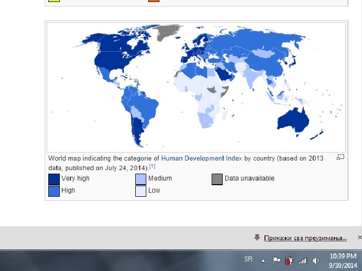 Indeks ljudskog razvoja The Human Development Index (HDI) � Kao rezultat pokušaja da se pokazatelji iz različitih grupa - ekonomski, socijalni i ekološki, povežu u jednu širu meru dostignutog nivoa razvijenosti jedne zemlje, strucnjači programa Ujedinjenih nacija za razvoj su konstruisali Indeks ljudskog razvoja - HDI (1993). � To je formula kojom se meri siromaštvo, pismenost, obrazovanje, životni vek i drugi faktori za zemlje sveta. � Mnogi preko ove formule svrstavaju zemlje (187) u: q Razvijene zemlje (zemlje prvog reda), q Zemlje u razvoju (zemlje drugog reda) i q Nerazvijene (zemlje trećeg sveta).